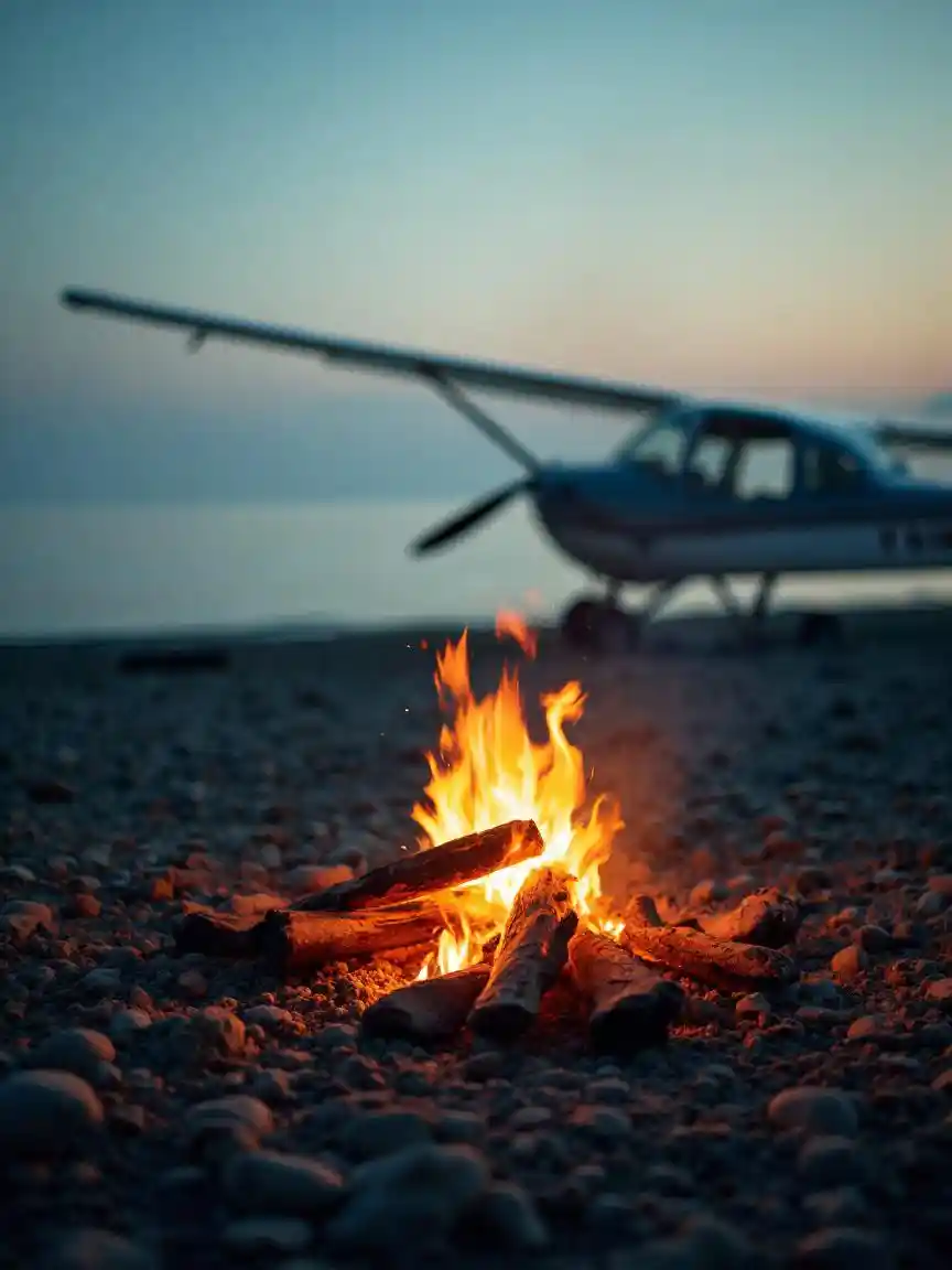 SebastianPhoto of a campfire on a beach with a small plane parked nearby, Kodak film photo, evening light