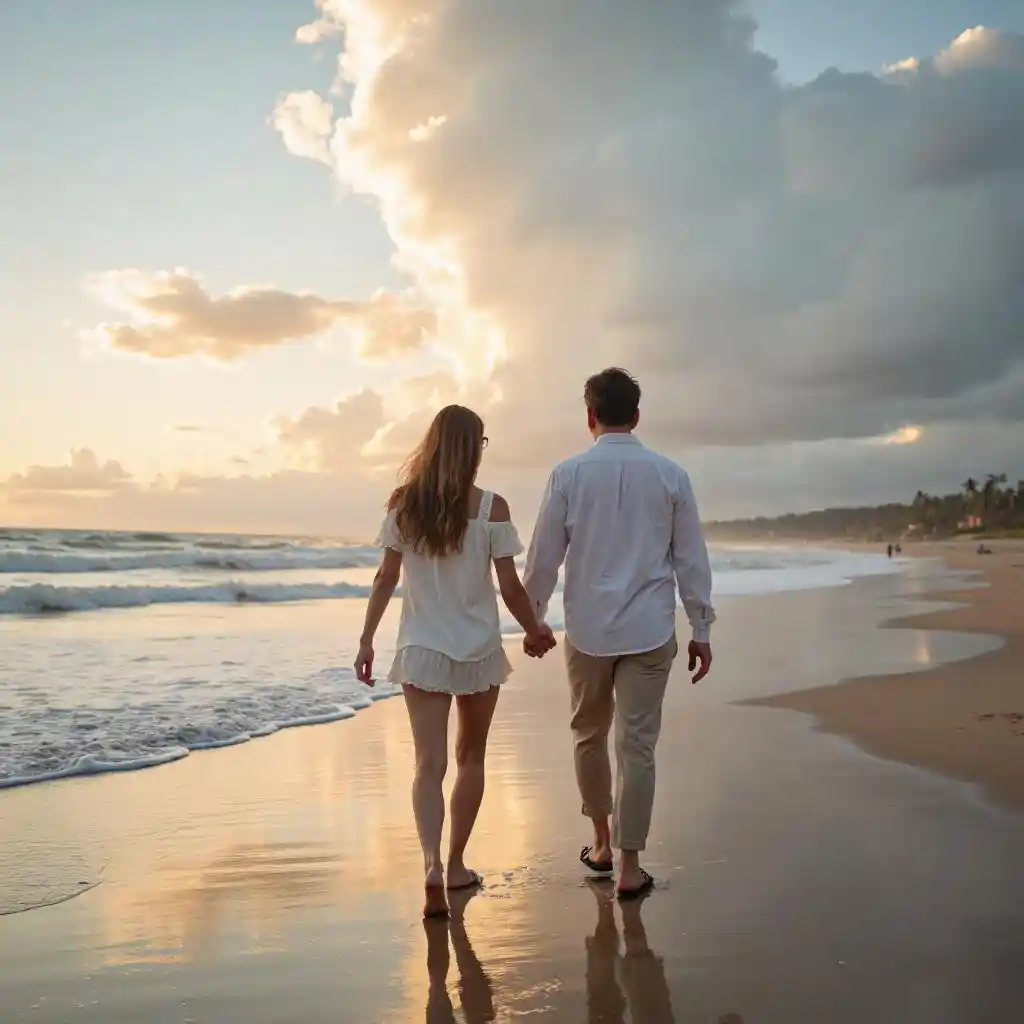 Couple Walking on a Beautiful Cloudy Beach