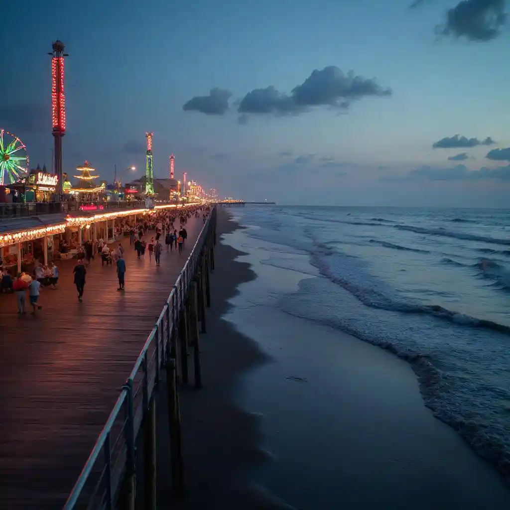 MaverickA bustling boardwalk beside a tranquil beach, with carnival lights twinkling at dusk.