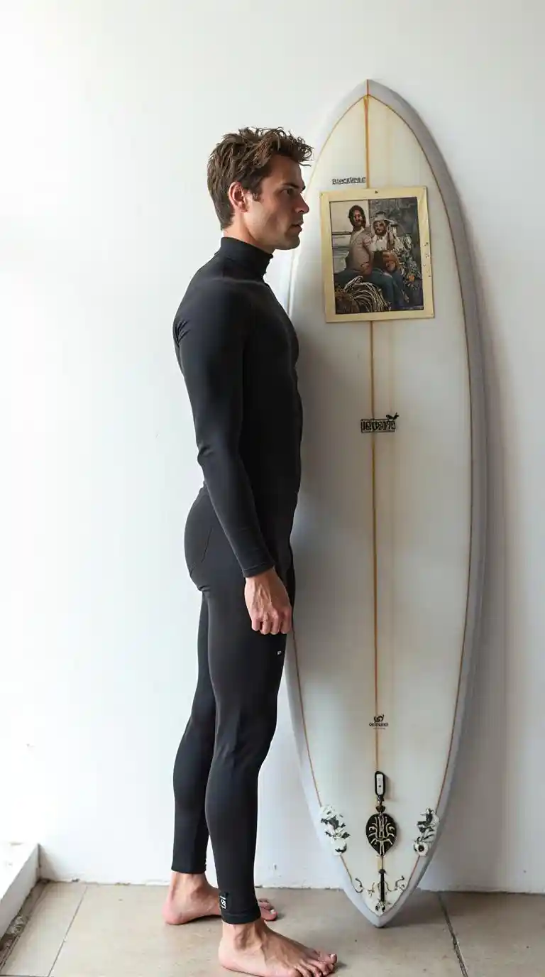A full-body profile of a surfer from Biarritz standing against a white wall, holding a surfboard in front of him from head to toe. He is wearing a fitted black wetsuit with the texture of the material highlighted, and he is barefoot, showcasing a casual and relaxed stance. The surfboard features unique designs representing the surf culture of Biarritz, contrasting against the plain white background. The lighting accentuates the surfer's athletic build and the details of the wetsuit, creating a vibrant and dynamic composition.