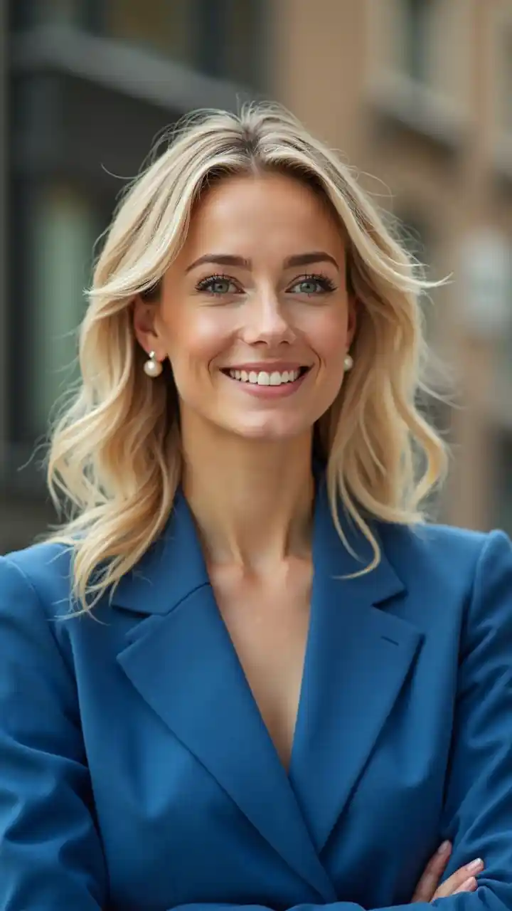 business lady young blonde enfas blonde ponders smiles blue jacket pearl earrings