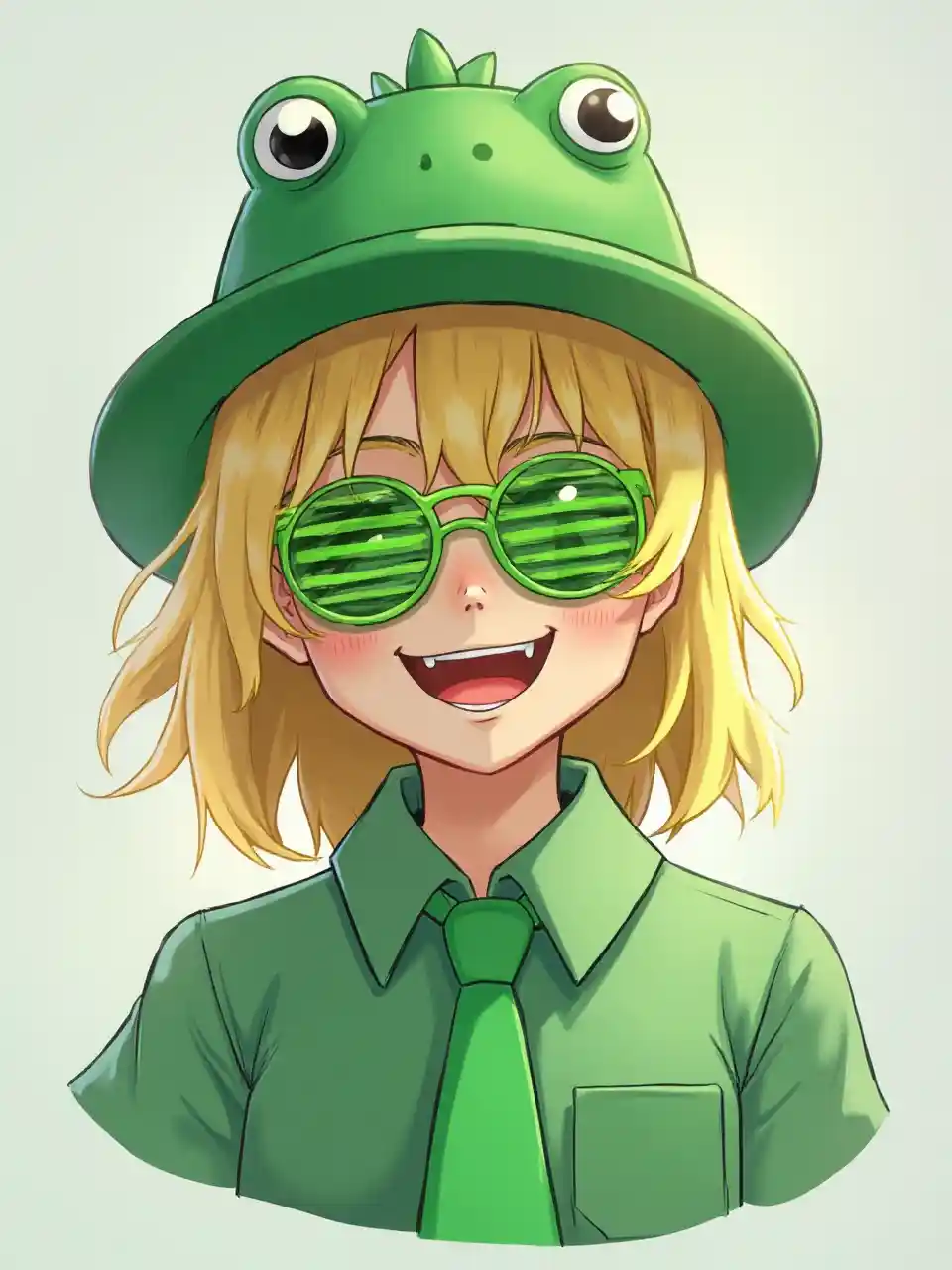 Draw me my Roblox character, into an actual human. It is a blonde guy with halfly long hair (the hair is called blonde manga hero), with a green dinosaur hat (the hat is called Hungry dino) with the face slight happy :D face, titled "Chubs" on Roblox, with neon green shutter shades, with a green tie, and green torso, and all the other body parts are white.