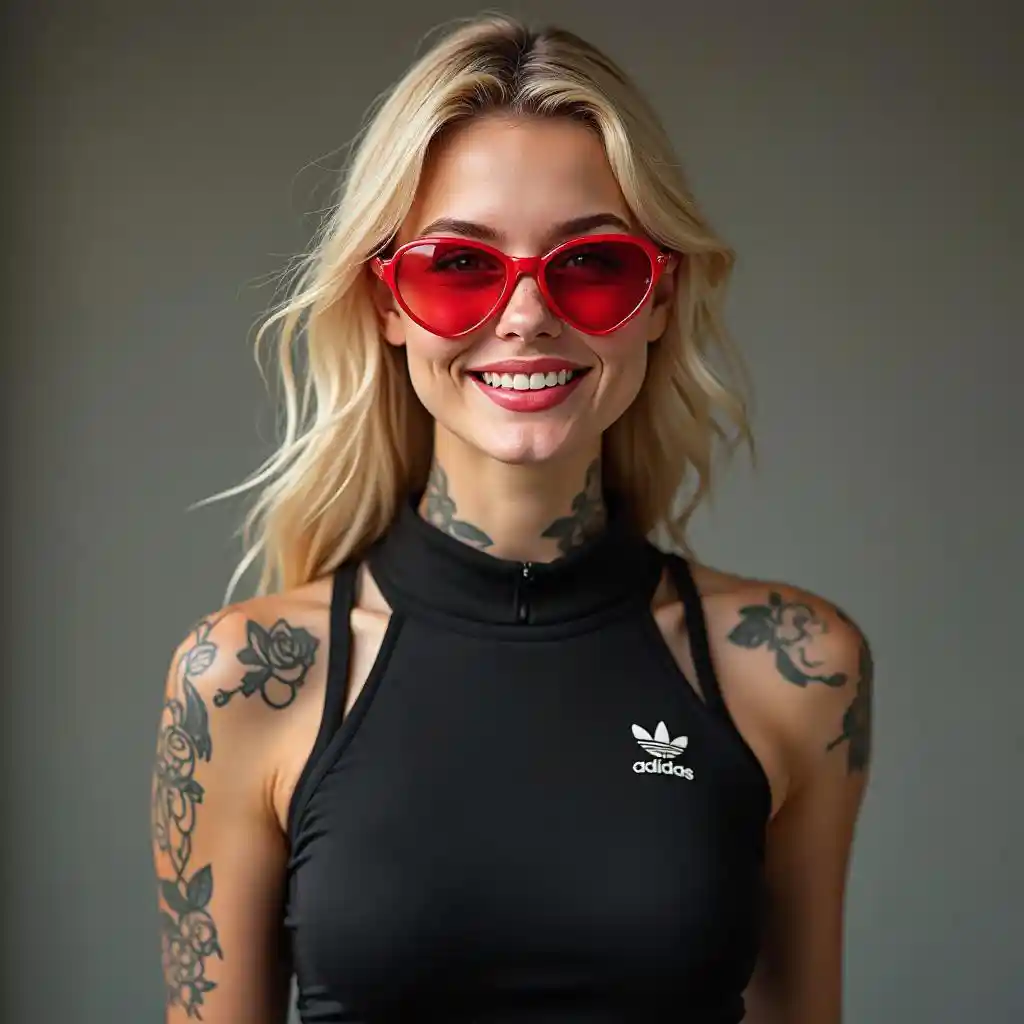 High quality, photo shoot, Super realistic blonde girl in a fancy black sports dress (adidas), make her beautiful, beautiful blonde hair, cute smile, heart-shaped glasses (red color), red carmin lips, bold, cheerful look, Vibrant Colors, Extreme Beauty, tatoos