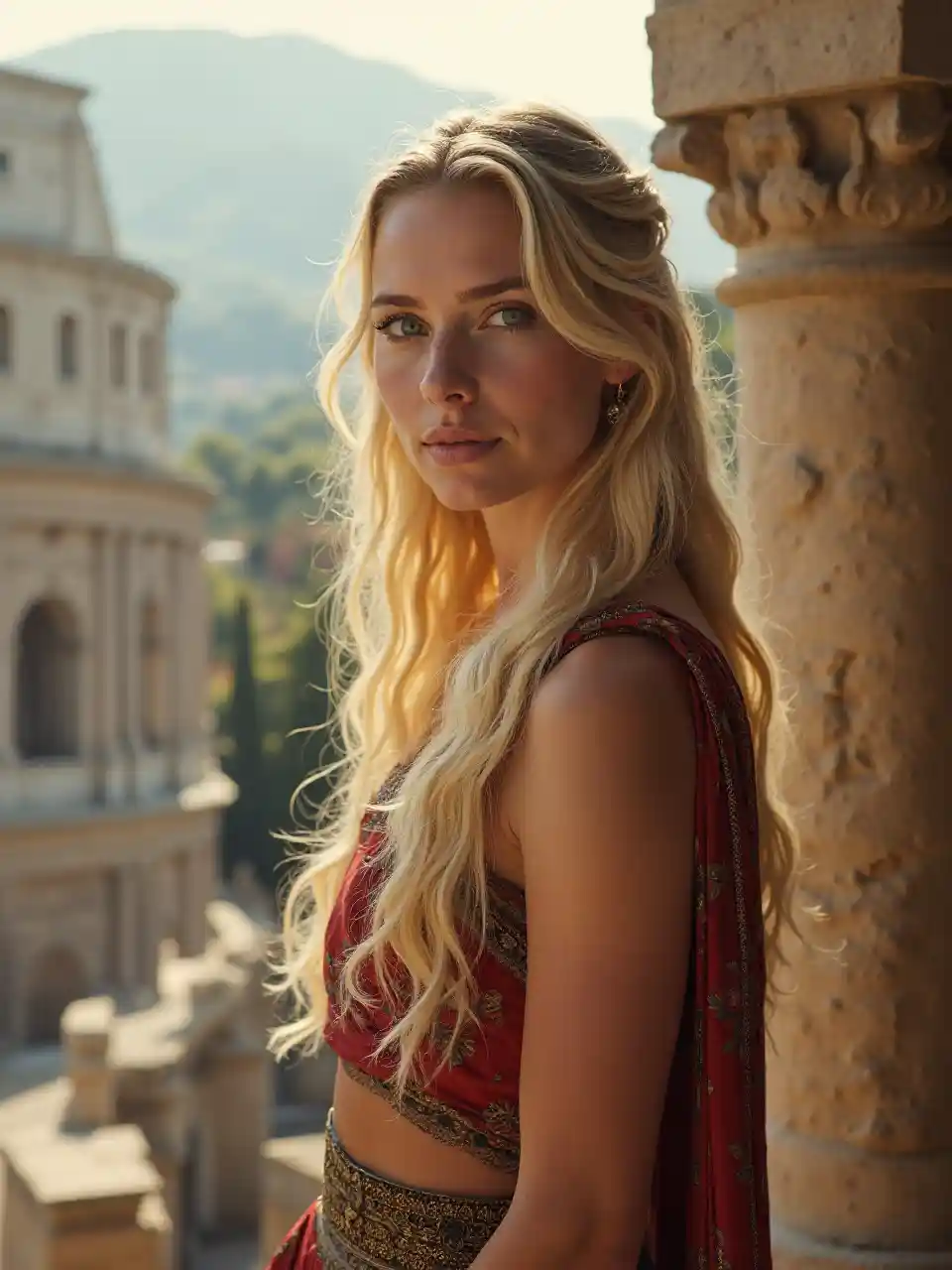 AdalynSwedish blonde woman should long hair , brown eyee in rome standing next to colosseum and looking from the profile full body