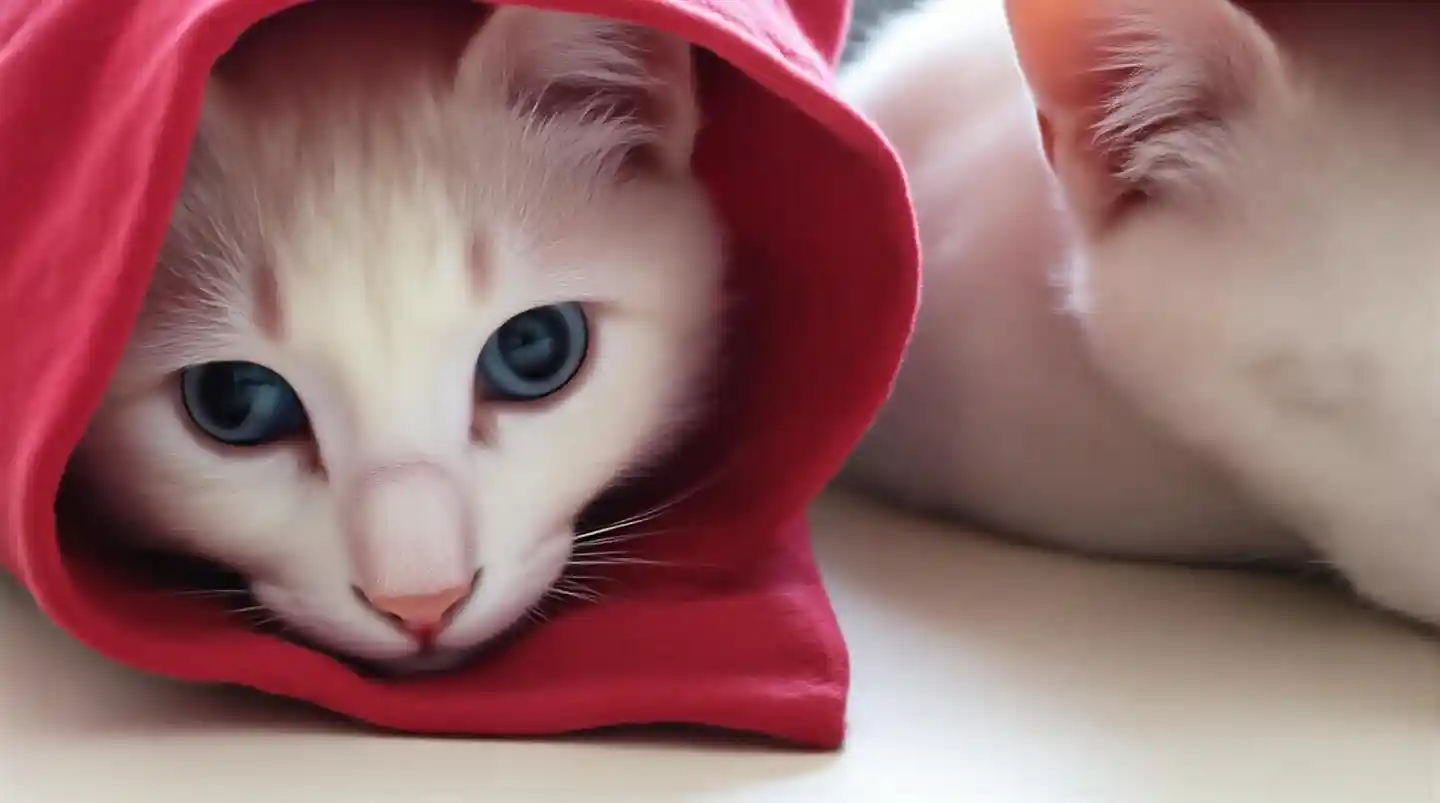 MiaThe image features a white cat with striking blue eyes, peeking out from under a red cloth that covers its head. The cat's fur is soft and fluffy, and it appears to be in a cozy, relaxed state.
