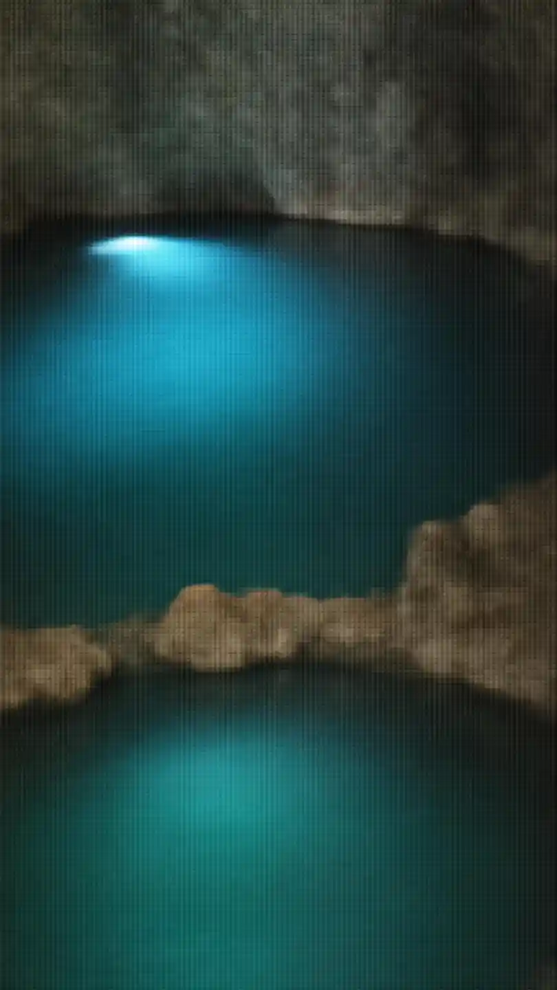 SebastianA mesmerizing underground cave illuminated by an ethereal blue glow, reflecting off the still, crystal-clear water. The cave’s rugged rock formations, naturally