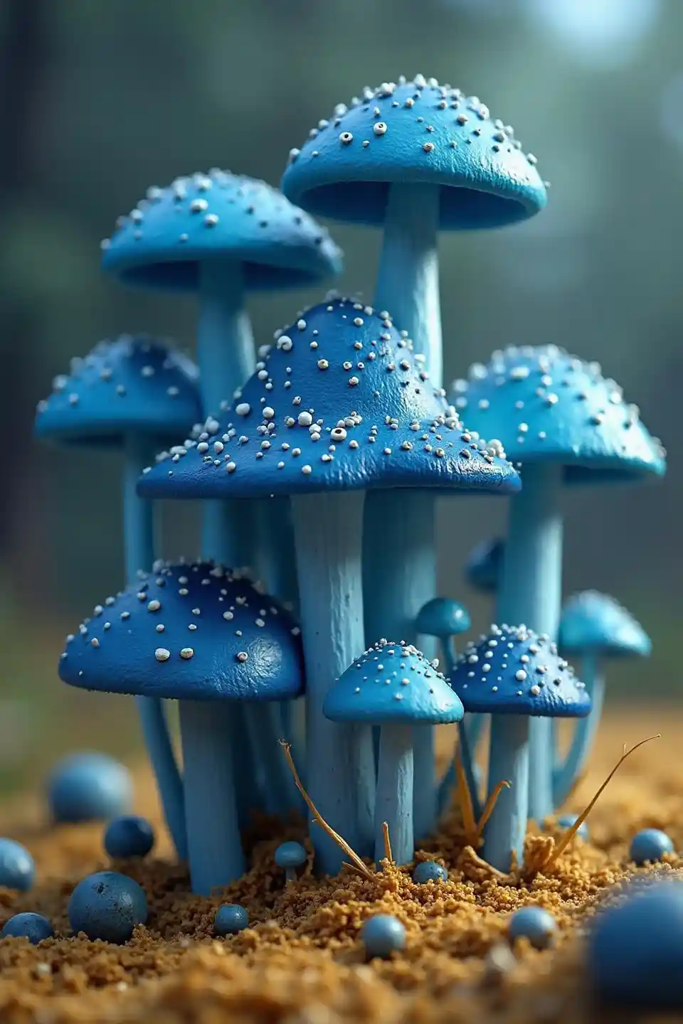 A surreal dream world. Blue mushrooms are growing on golden earth. The mushrooms are all blue, with a gradation from light blue to navy blue. The mushrooms are