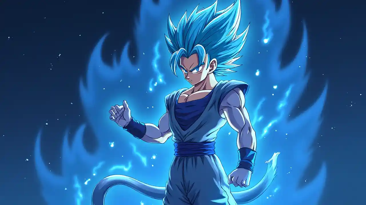 Anime character with blue spiked hair, muscular body, blue fur, and tail, surrounded by a blue aura in space.