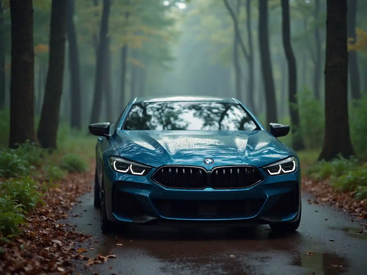 photo of bmw m8 in a forest and it's raining