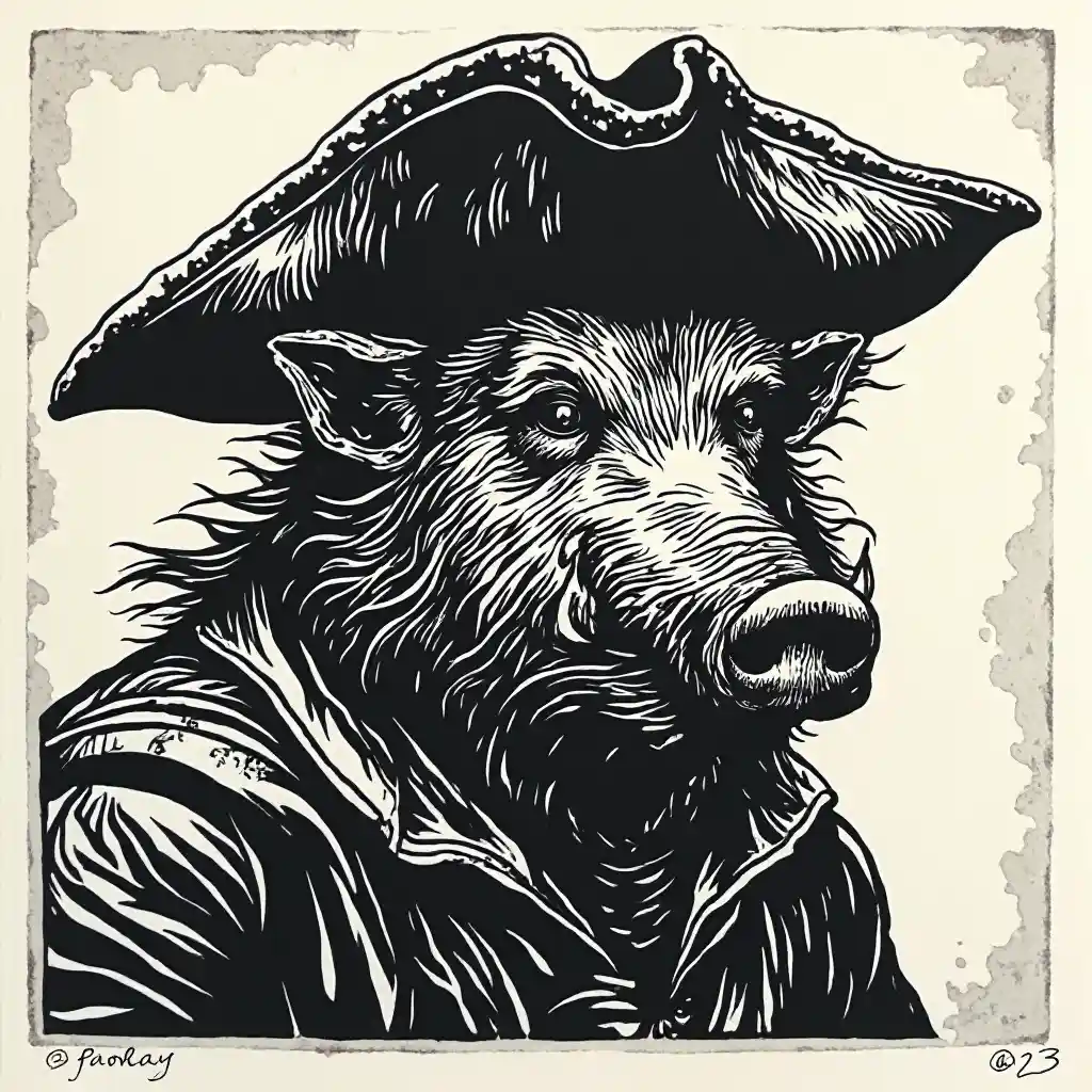 Black and white linocut postage stamp old pirate thick bold dark lines a wild boar
