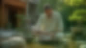 Middle Eastern Man Tending Bonsai in Courtyard