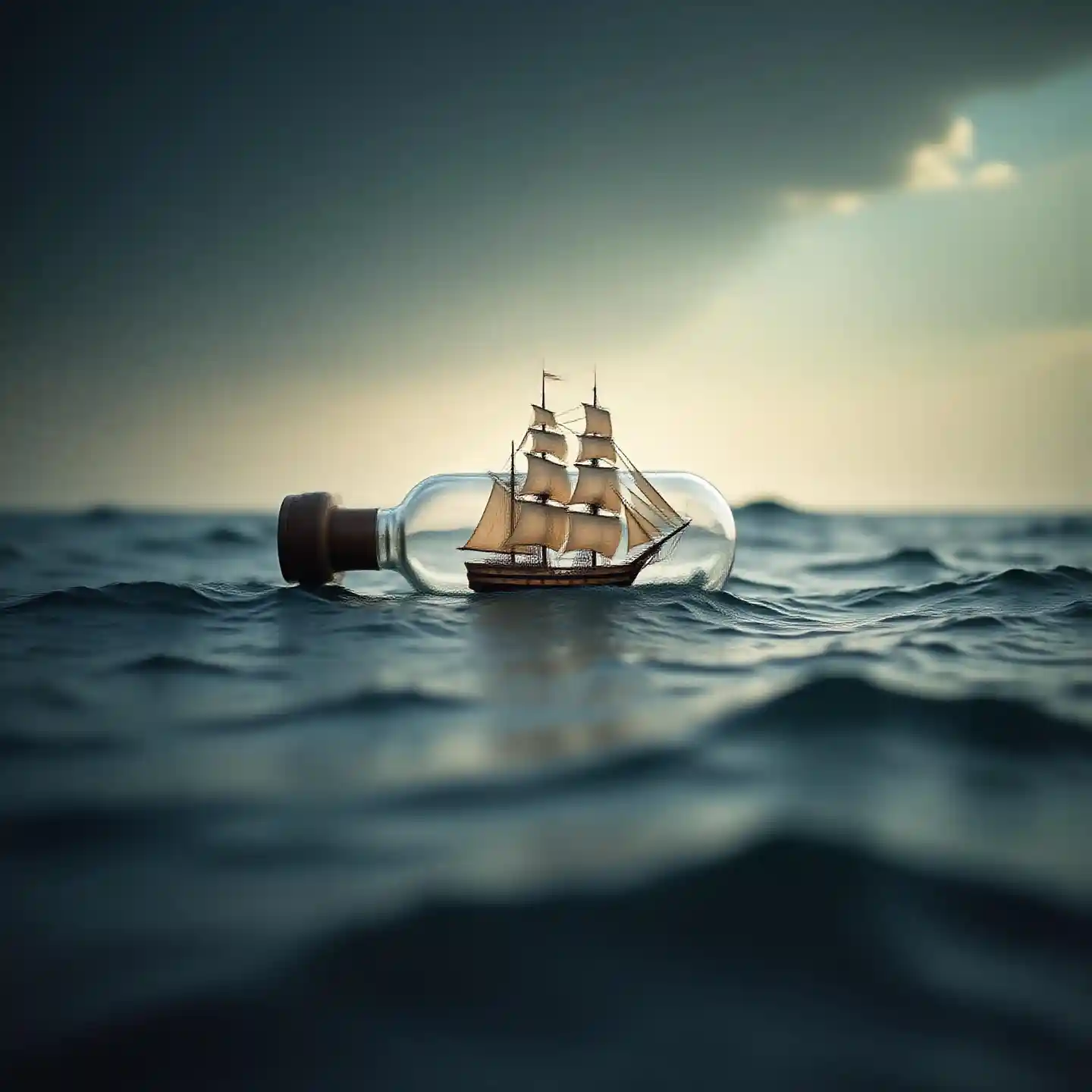 Masterpiece photo, photorealistic close up view of a ((ship in a bottle)) swimming in an endless ocean. The ship is a model of a 19th century sailing ship bark