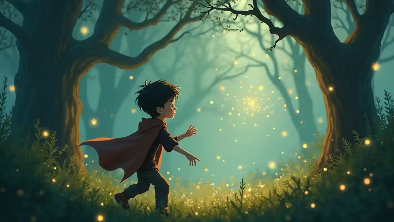 A 5-year-old Asian boy with bangs chases glowing orbs in a misty grove, wearing a cape with moon patches. Fireflies and twisted trees frame him, his eager dashes radiating wonder and whimsical charm in an enchanted, natural scene.
