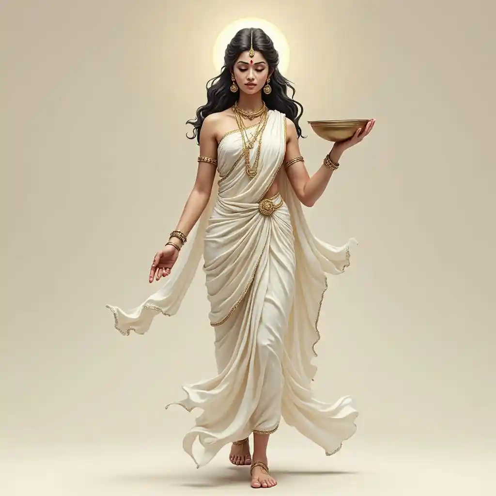 This image appears to depict Goddess Brahmacharini, the second form of Navdurga, as celebrated on the second day of Navratri. The pose in the image conveys elegance and devotion, with several symbolic elements: Posture: The figure stands in a graceful, forward-moving stance. Her walking pose, with one foot slightly lifted, suggests a journey or movement, possibly symbolizing her determined and devoted path toward spiritual knowledge. Hand Gestures: The right hand holds a Kamandalu (a water vessel), a symbolic attribute associated with Brahmacharini, representing asceticism and devotion. This posture of holding the Kamandalu is indicative of her spiritual journey and austerity. Attire: The traditional draped white sari enhances her aura of purity and asceticism, with flowing fabric that adds a sense of motion and divinity. The layers of jewelry show her divine status, blending simplicity with spiritual grandeur. Expression: The serene and calm expression on her face reflects inner peace, dedication, and devotion, which are core attributes of Brahmacharini. The entire pose and aesthetic of the image seem to emphasize a goddess embodying wisdom, devotion, and purity, aligning well with the significance of Brahmacharini in Hindu traditions.