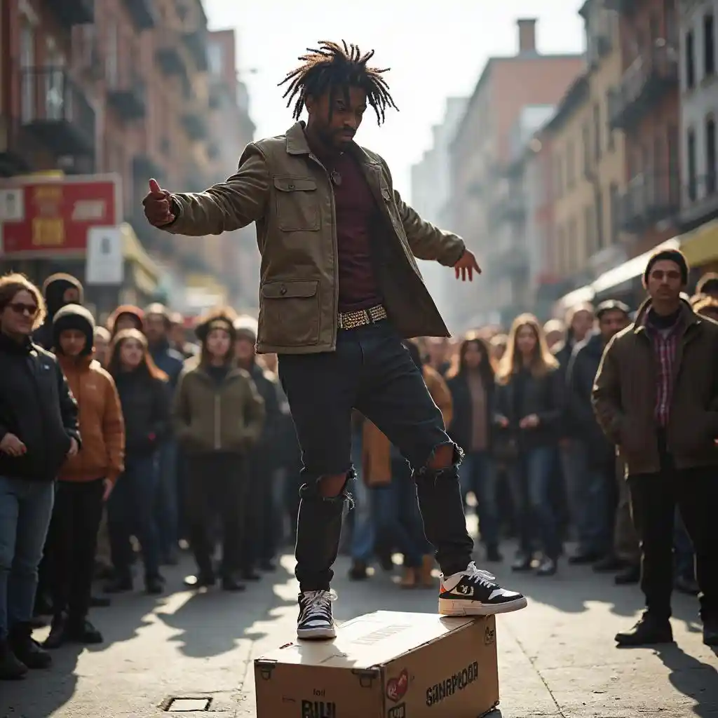 man breakdancing in the bronx, surrounded by crowd of people, spinning on bis head on cardboard, cool, stylistic
