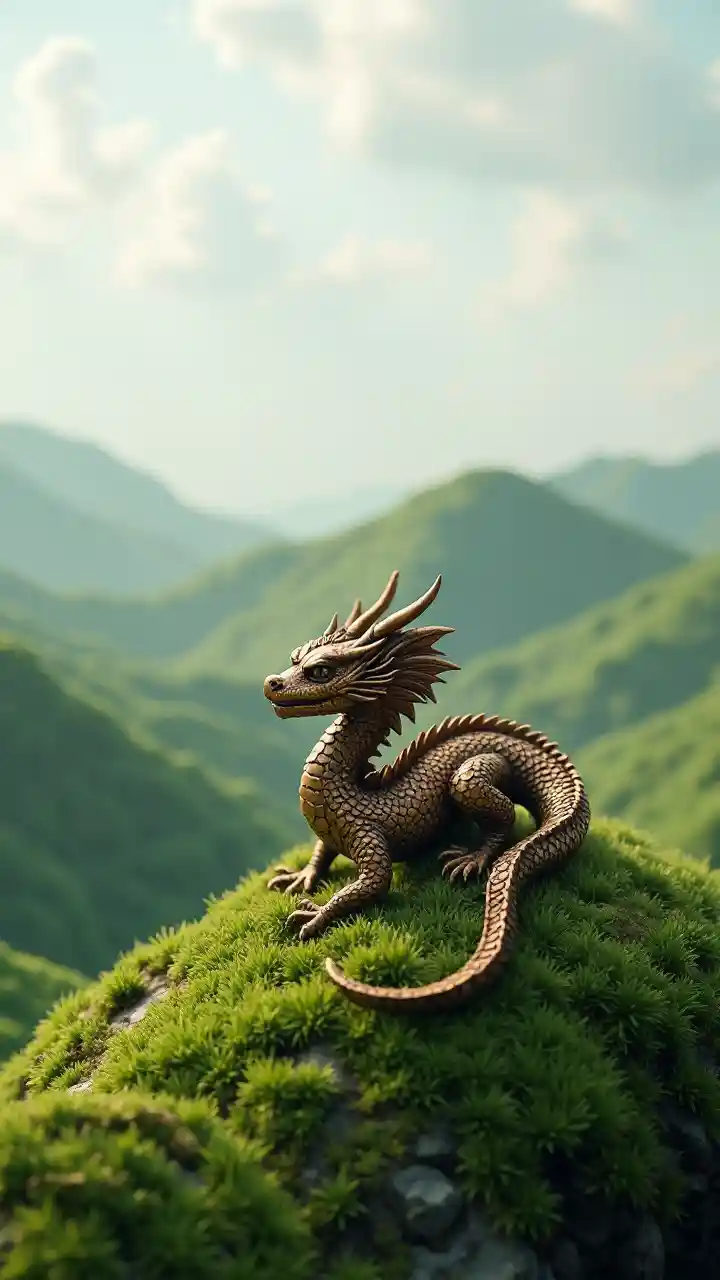 A small bronze dragon on a green hill with a rolling landscape in the background, in a style of the image I provided