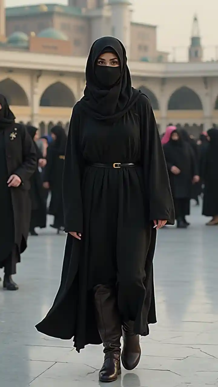 Make me a burka woman wearing over the knee boots and walking in Mecca at kabba
