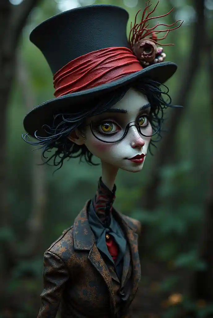 high image quality , masterpiece, accurate, top quality, high image quality model, High detail, Tim Burton style, Mad Hatter , ((Slender Woman、glasses)), In f