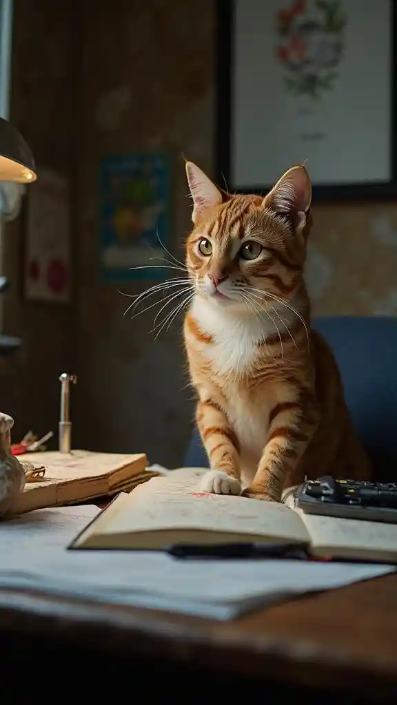 masterpiece, best quality, photo cinématique d'un chat à son bureau, il est surchargé de travail, , photographie, film, high resolution