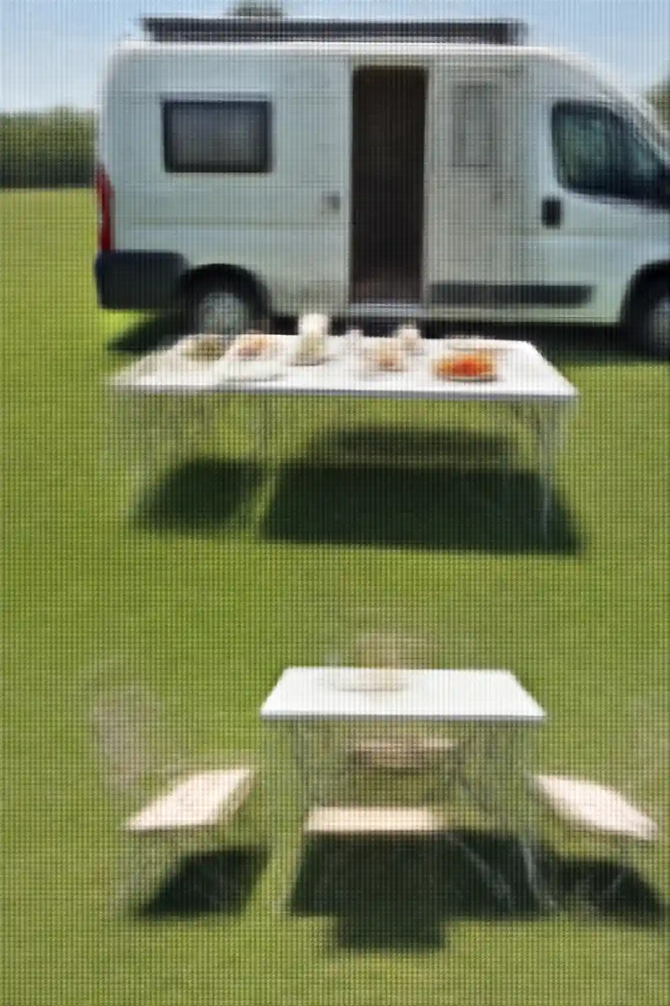 Adalyna cozy camping van parked in a sunny grassy meadow, with a picnic table set up beside it, plates of simple food, fruits, and tea laid out, a small and friendly