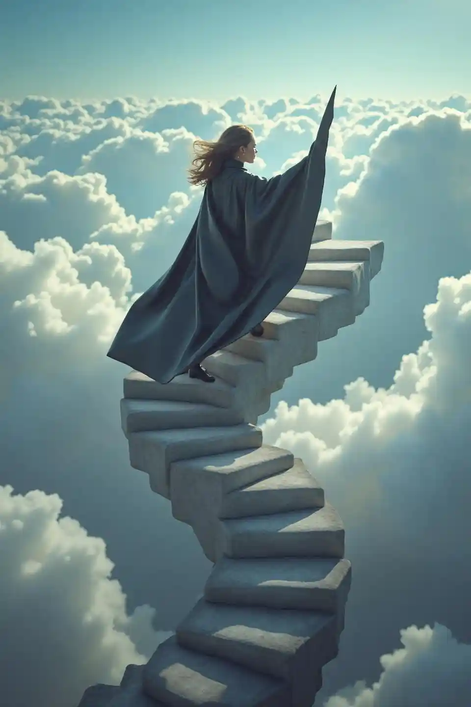 A woman wearing a black leather costume and fluttering a very long cape up the spiral cloud stairs descending from the clouds in the sky,The sight of a cape blo