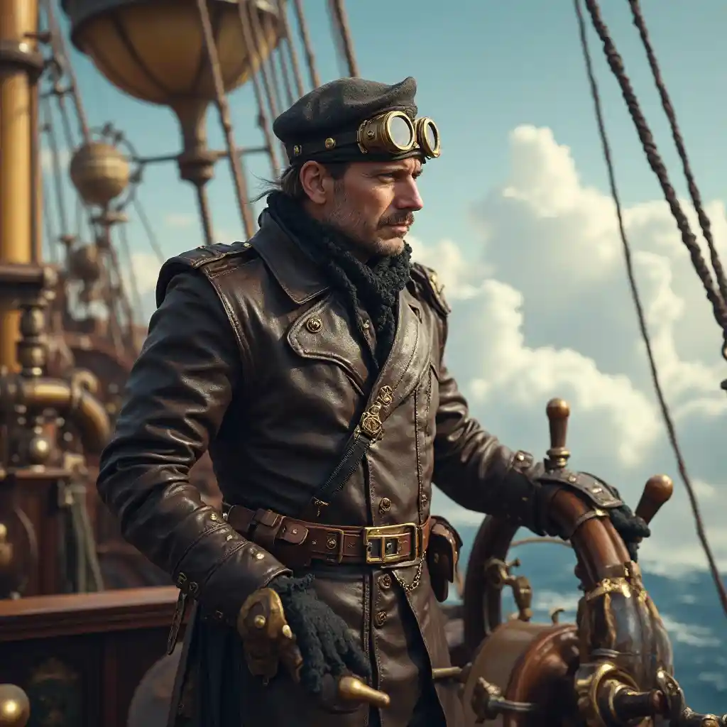 A steampunk airship captain with a brass monocle, leather jacket, and goggles, standing at the helm of a flying ship with clouds in the background."