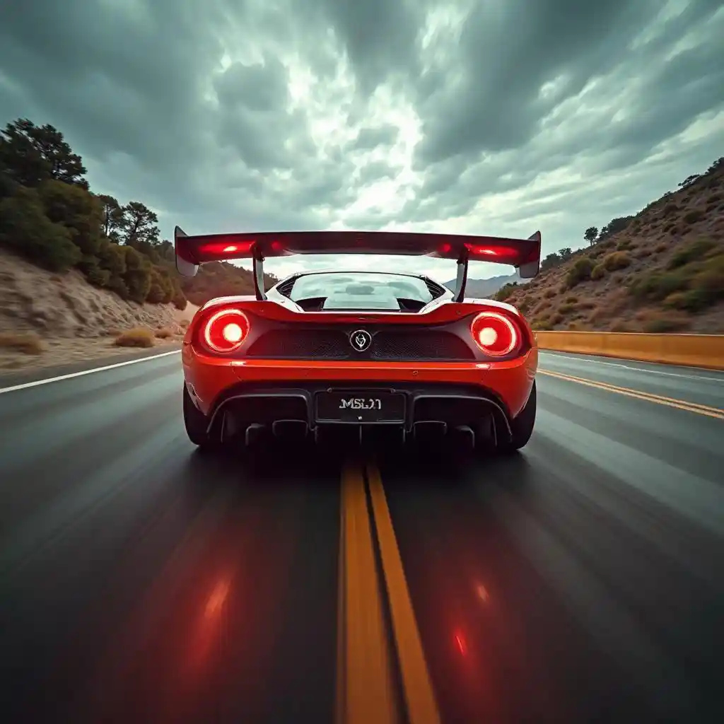 a car chase scene, dramatic ultra wide lens action shot of the back of a sports car racing across the scene, close up, the car is extremely close to the camera, fisheye lens, frog perspective, dramatic speed, motion blur