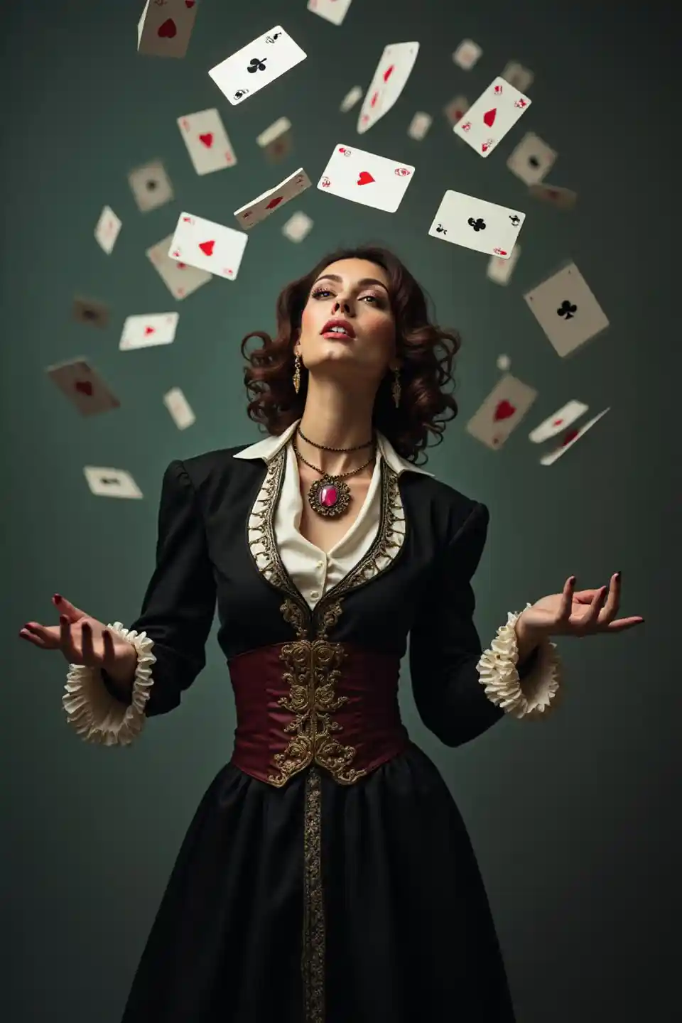 MadelynA female magician dressed as a magician and throws cards very high,As if the number of cards proliferated, it became more numerous in the air ,Capturing fantast