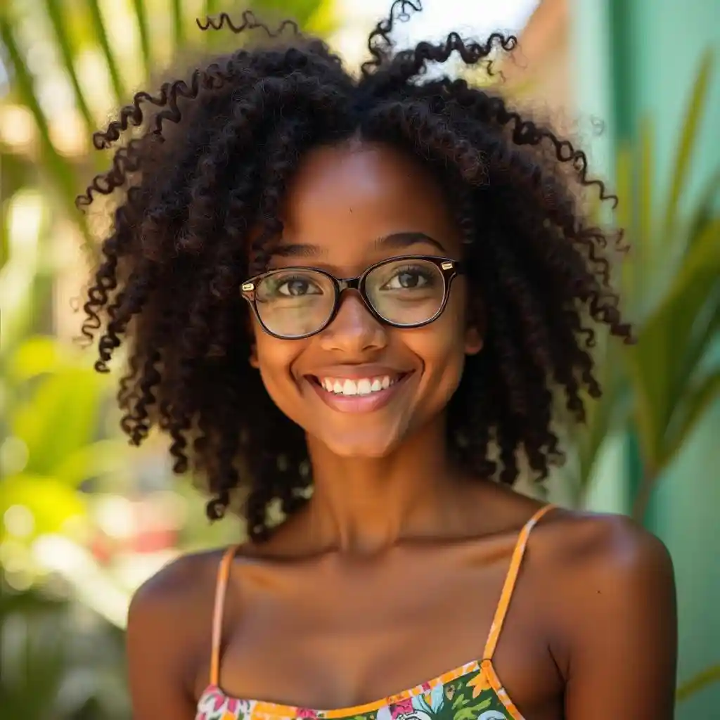 “A beautiful young Latina girl from the Dominican Republic, with warm brown skin and a radiant smile. She has striking, beautiful eyes framed by stylish glasses. Her hair is dark, slightly curly, and full of volume, reflecting her Caribbean heritage. The setting is bright and colorful, with tropical elements like palm leaves and sunlight in the background. Her outfit is vibrant and lively, perfectly capturing the essence of the Caribbean. The overall look is natural and joyful, emphasizing her cultural roots and the warmth of her personality.”