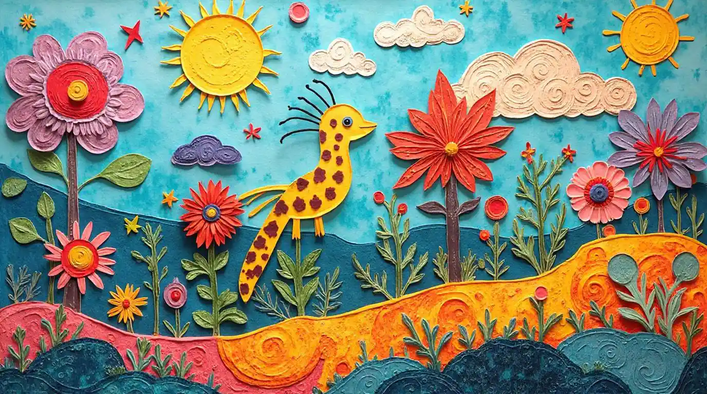 Hand-painted texture mapping material,, Eric Carle style, children's picture book illustration, using hand-painted paper, then cutting these papers into different shapes and collaging them into images, full of texture and layering, bright and vivid colors say