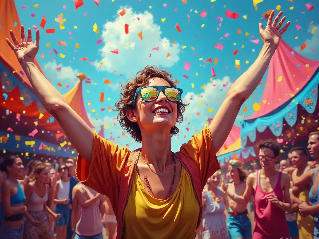 Joyous celebration in a vibrant carnival, lively and colorful, oil painting, confetti-filled air, cheerful crowd, dynamic brushstrokes, high energy, festive atmosphere, vibrant colors, lively characters, dynamic composition, carnival art, oil painting, 4k, ultra-detailed, vibrant, dynamic brushstrokes, lively, festive, colorful, high energy, oil painting, dynamic composition