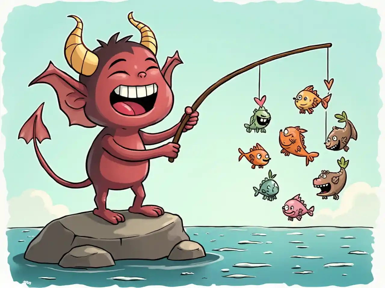 A cartoon devil stands on a rock, grinning and holding a fishing rod catching fish with Christian symbols.