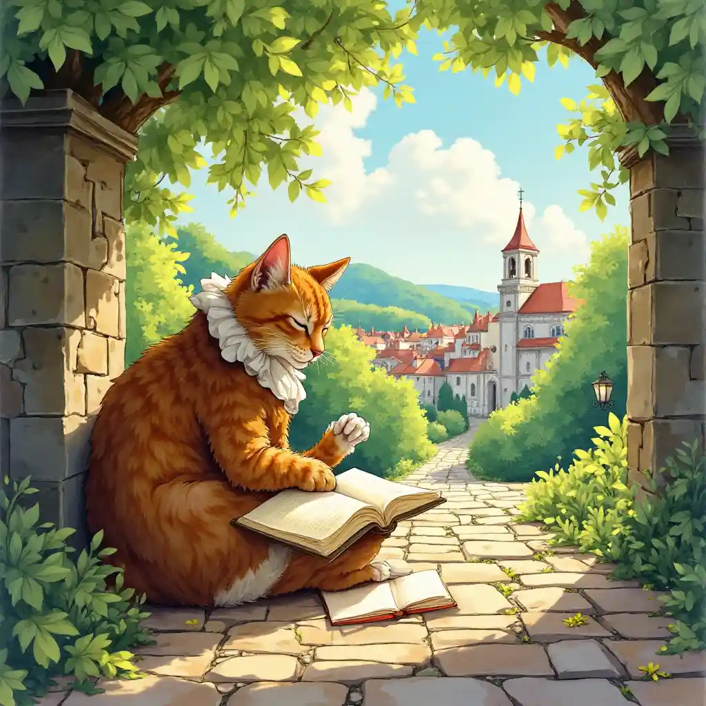 storybook illustration of cat-like Leonardo Davinci, who examines his paw as he naps on a sunny cobblestoned path, book and quill discarded, dappled sunlight filtering through springtime trees in a lush Renaissance garden, fine arts watercolor painting, vibrant colors contrasting the shadows, distant Renaissance town, captivating and whimsical atmosphere, highly detailed, breathtaking scenery, evocative storytelling elements, masterfully crafted.