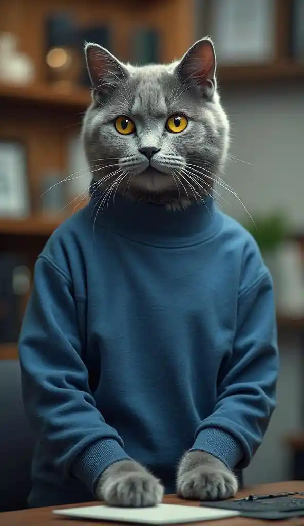photo 8K Ultra HD, Masterpiece, best quality, extremely Realistic, full body view. gray cat office worker, realistic blue sweatshirt, detailed, portrait, cat wi