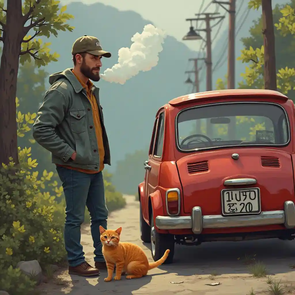 Cooperthe cat and its owner are standing near a red car, the owner is smoking