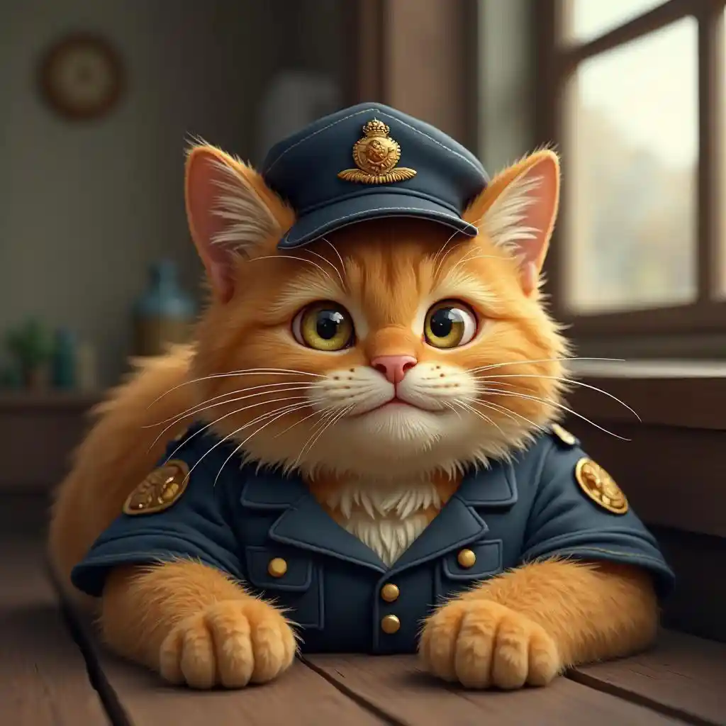 a cute fat orange cat serves as stationmaster at a rural station, wearing uniform, cap, lying down, detailed fur, 8k resolution, masterpiece, very realistic, 8k