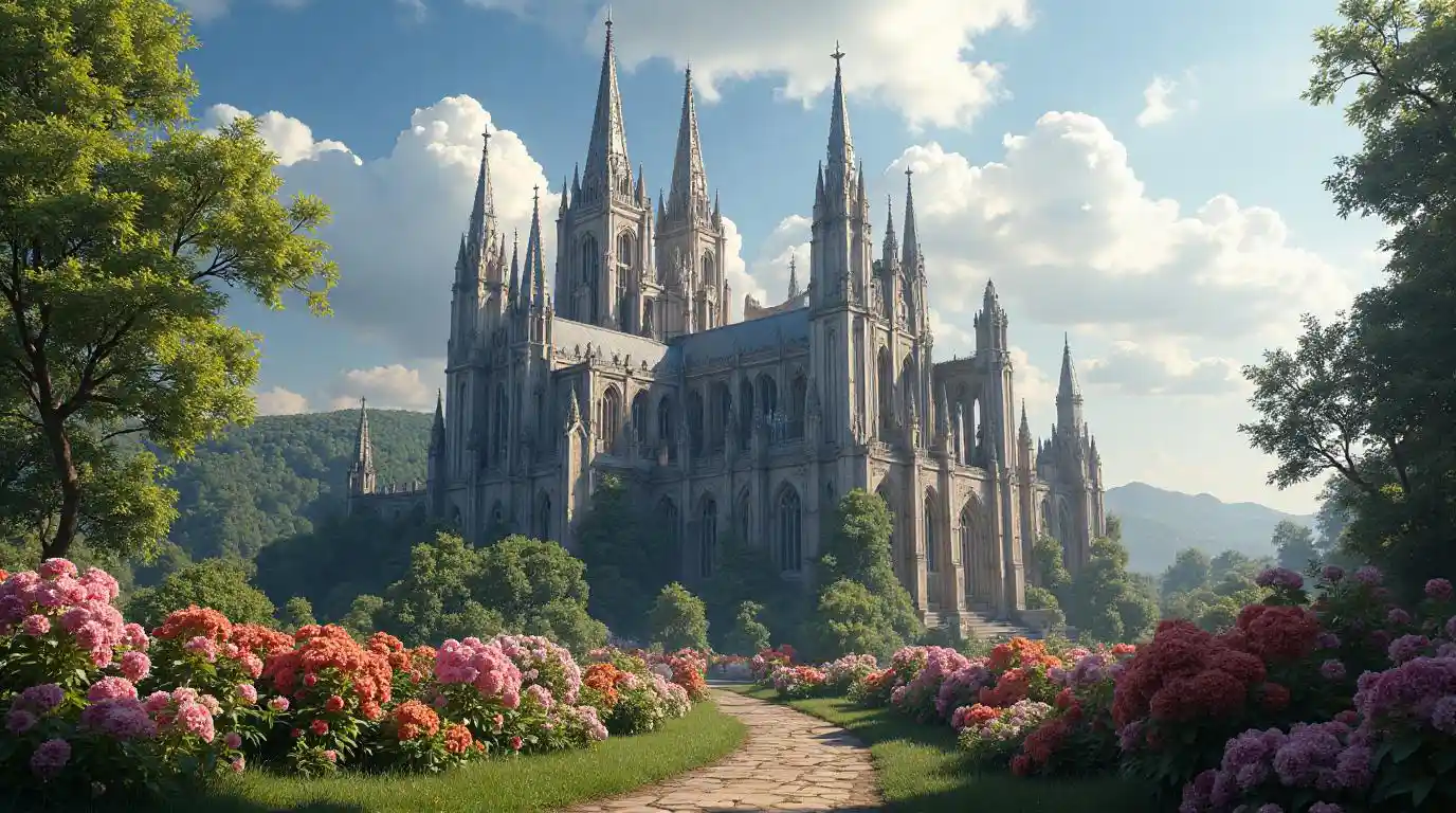 A gothic cathedral, its spires reaching for the heavens, surrounded by blooming gardens.