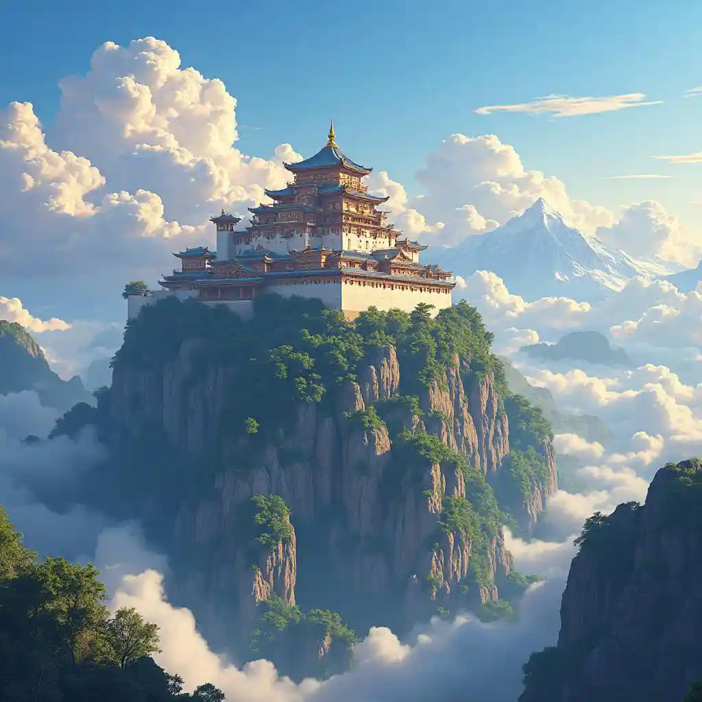 Majestic palaces on mountaintops, courts of celestial beings, mirroring mythical anime aesthetics.