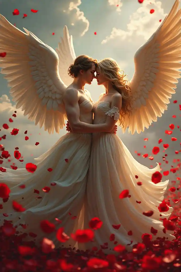 A divine male and female angel, their (radiant wings:1.3) intertwined amidst a storm of (shattered crimson rose petals:1.4), trapped in a cruel dance of celesti