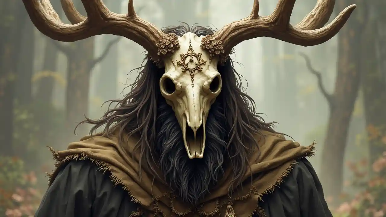 Sebastianportrait of a Celtic pagan druid wearing a stag skull mask, rune symbols, fantasy concept art, highly detailed