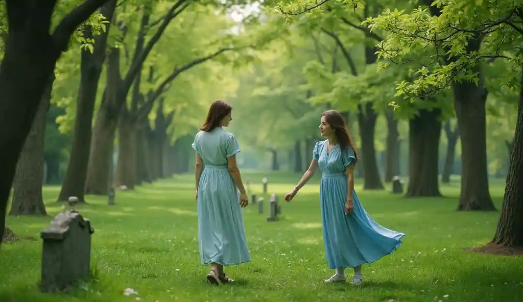 ElijahIn a beautiful, peaceful, green, spring, serene, dense trees park of cemetary, view from above, a middle-aged mother wearing a light blue dress and a middle-age