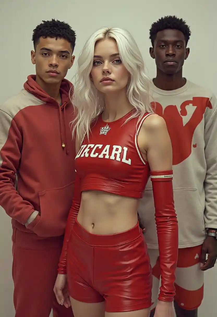 1girl, multiple men, young model, ((leather cheerleader)), cutoff sweatshirt, red clothing, white clothing, exposed navel, (forehead), white hair, ((extremely l