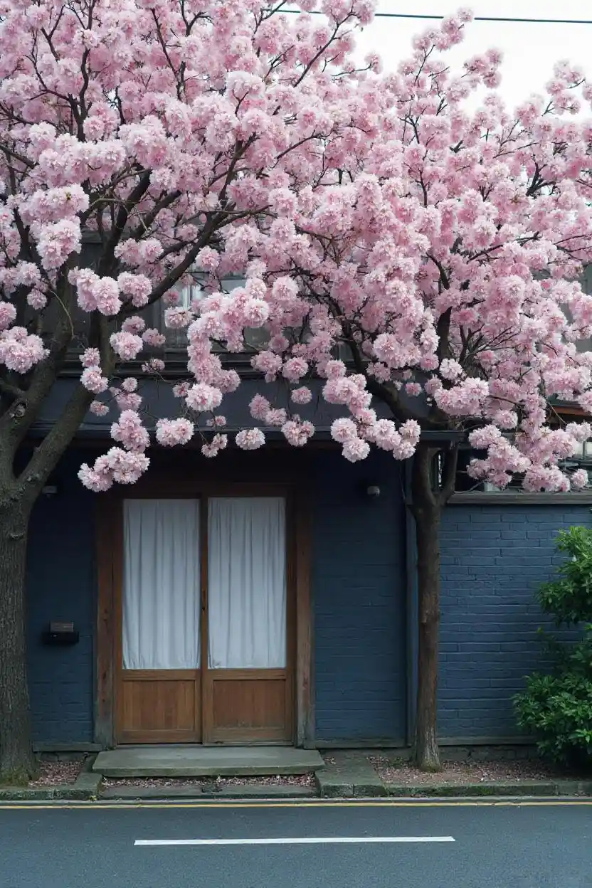 ChloeIn the evening, there are cherry blossoms in front of an ancient-style house with white curtains on one side and dark blue tiles on the other, in the style of Rinko Kawauchi. -
