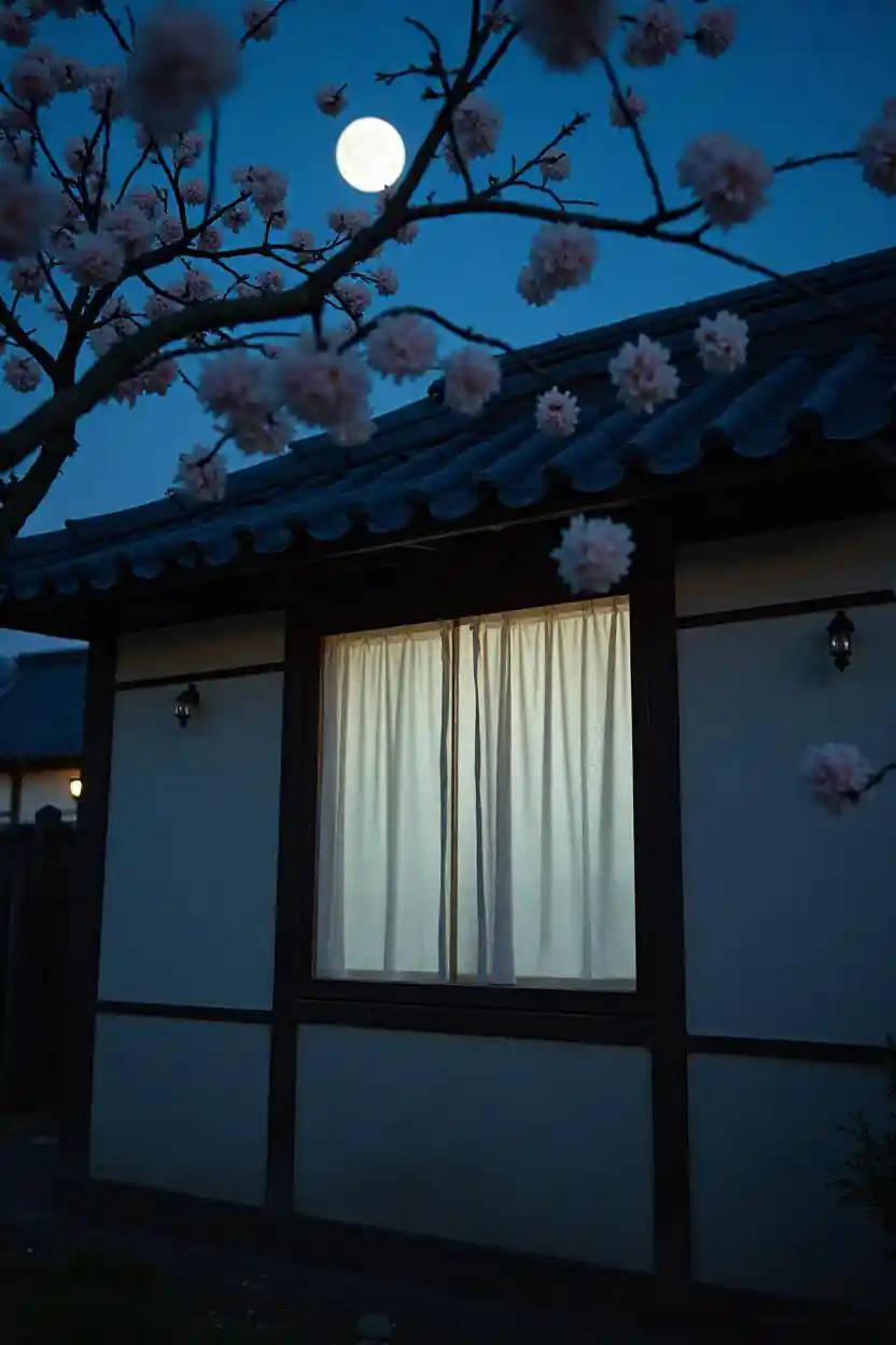 A white curtain in the window of an ancient-style house, surrounded by cherry blossoms at night under moonlight, photographed from outside through trees with green leaves and a blue sky. The scene is captured using a Sony Alpha A7 III camera in the style of Kodak Portra film.