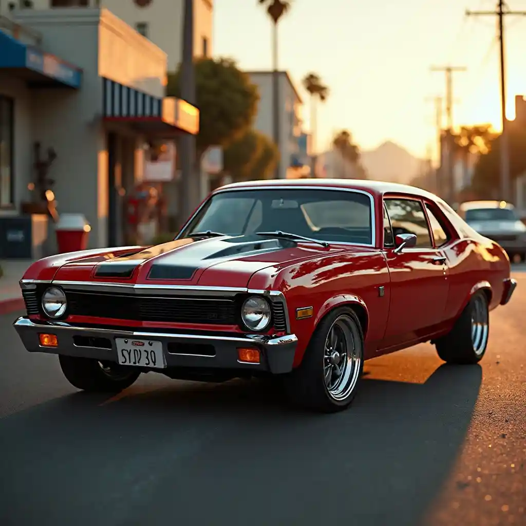 1972 Chevy Nova, low to the ground, dark candy apple red with striking black stripes, vintage muscle car aesthetic, gleaming chrome accents reflecting light, captured in a dynamic angle that emphasizes its performance appeal, set against a backdrop of a retro city street, warm ambient sunset lighting, ultra-detailed, high-definition, cinematic presentation, capturing the essence of classic American automotive design.