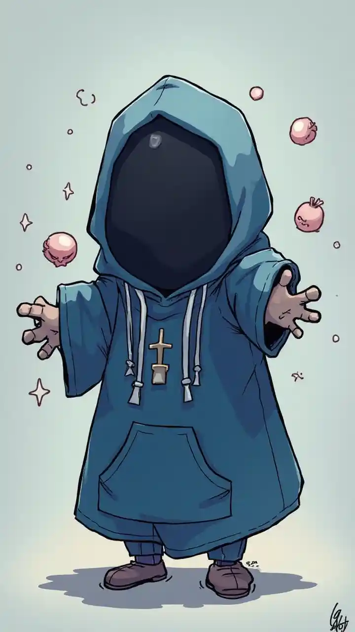plague doctor arms outstretched wearing a blue hoodie → chibi