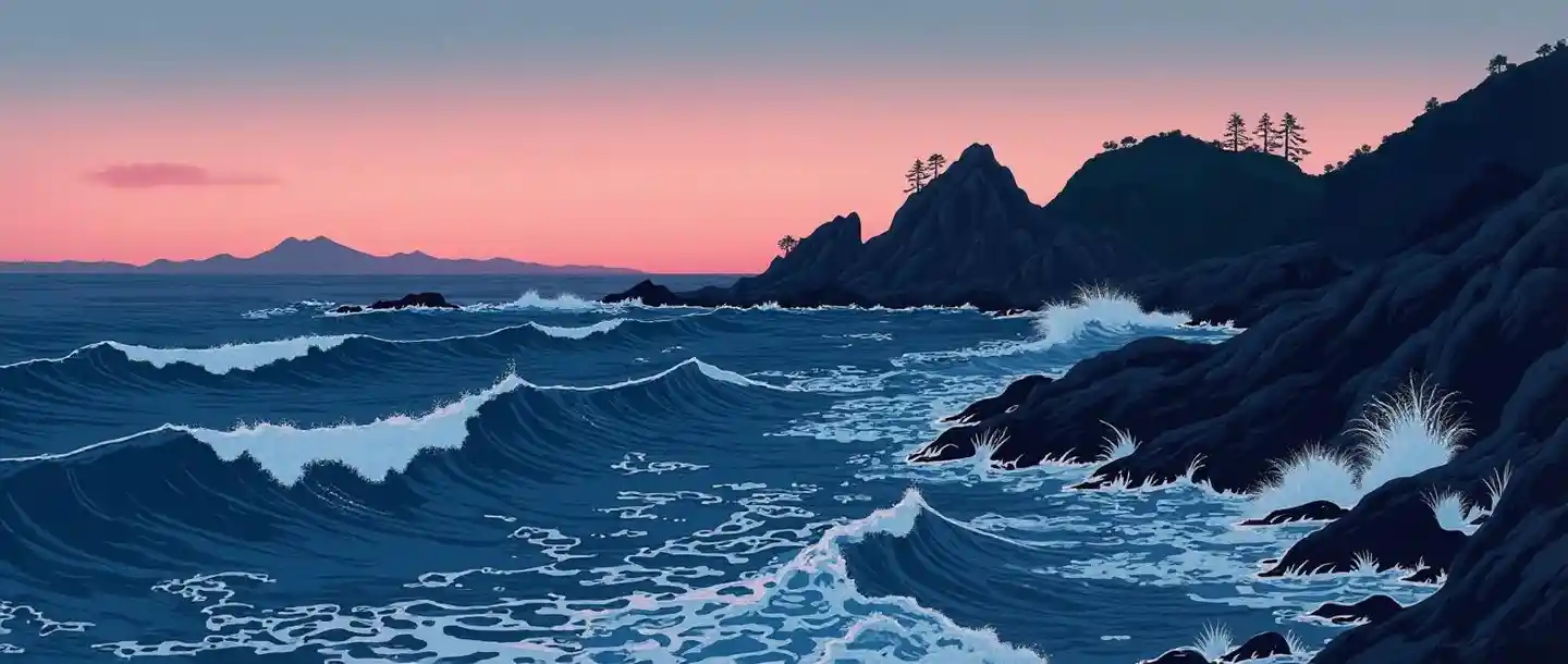 Dark underexposed painting, stark contrast, Kawase Hasui, a Japanese woodblock print depicting the sea and rocks in front of Chichirijima Island, with a pink sky at dusk, blue waves, and black rocks, high saturation, dark blue color palette