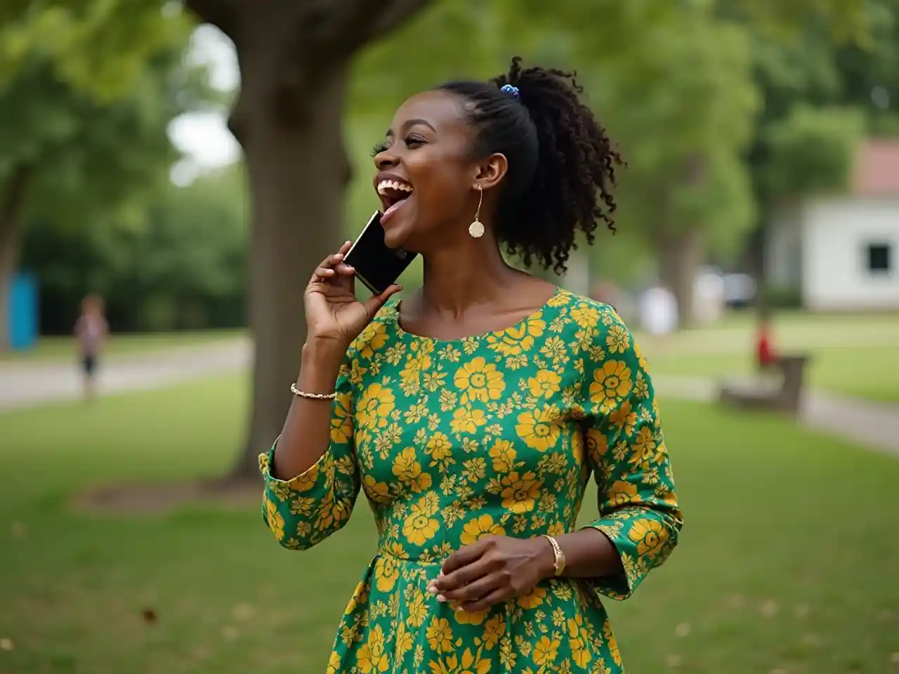 a woman in a green and yellow outfit is talking on a cell phone and laughing while standing in front of a tree, Chinwe Chukwuogo-Roy, lyco art, cheerful, a photocopy