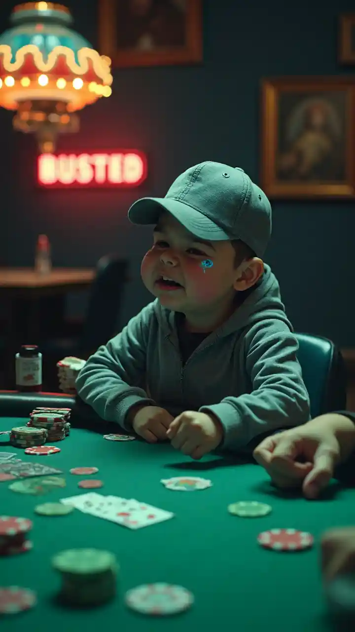 Title: “Last-Chip Lament” SHOT 1 – TABLE CLOSE-UP (0-3 s) Cinematic dolly across a cluttered poker table lit with dramatic top-light. Green felt, scattered chips, cards, and a single last $25 chip in the foreground. Lens: 35 mm, shallow DOF, Marvel-grade color grade (teal/orange). SHOT 2 – HERO REVEAL (3-6 s) Cut to side profile of our player (baseball cap backwards). He sighs; oversized, glossy **anime-style blue tears** burst from each eye and stream down, his **lower lip inflates into a cartoonish wobble**. Camera pushes in; HDR skin texture + stylized cel-shaded tears. SHOT 3 – POWER-DOWN TRANSFORMATION (6-10 s) Electric blue energy crackles (Kirby-Krackle VFX). Body shrinks in a swirling particle vortex → morphs into a chubby **crying baby** in identical cap and tiny hoodie. Tears now even bigger; baby pounds tiny fists on felt. Phantom-cam speed-ramp (120 fps → 24 fps). SHOT 4 – TABLE-WIDE PAY-OFF (10-13 s) Wider crane shot: other players stare, jaws dropped. Chips fly off table as baby’s wail triggers shock-wave (subtle ripple shader on air). Neon HUD overlay flashes “BUSTED!” SHOT 5 – MARVEL TAG (13-15 s) Logo smash: metallic text “POKER: END GAME” slams down with lens-flare. Quick stinger of dealer cheekily shaking tip jar. AUDIO • Intro: low-rumble sub-bass + card-shuffle foley. • Tears pop SFX + comedic violin “sad trombone” lick. • Transformation: rising synth gliss + baby cry. • Final sting: orchestral hit + cymbal swell. LIGHTING & STYLE Marvel Studios polish, volumetric dust, rich contrast, anamorphic flares. Keep humor foregrounded, but with superhero-film production value. DURATION: 15 s total.