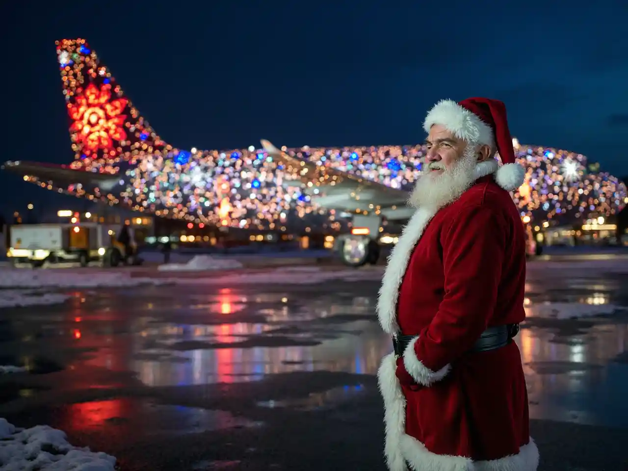 A festive Airbus A320, adorned with vibrant Christmas decorations, is showcased at the airport, with Santa Claus standing proudly on the tarmac, greeting passengers with a warm smile and a twinkle in his eye as the plane glistens with holiday cheer under the winter sky.